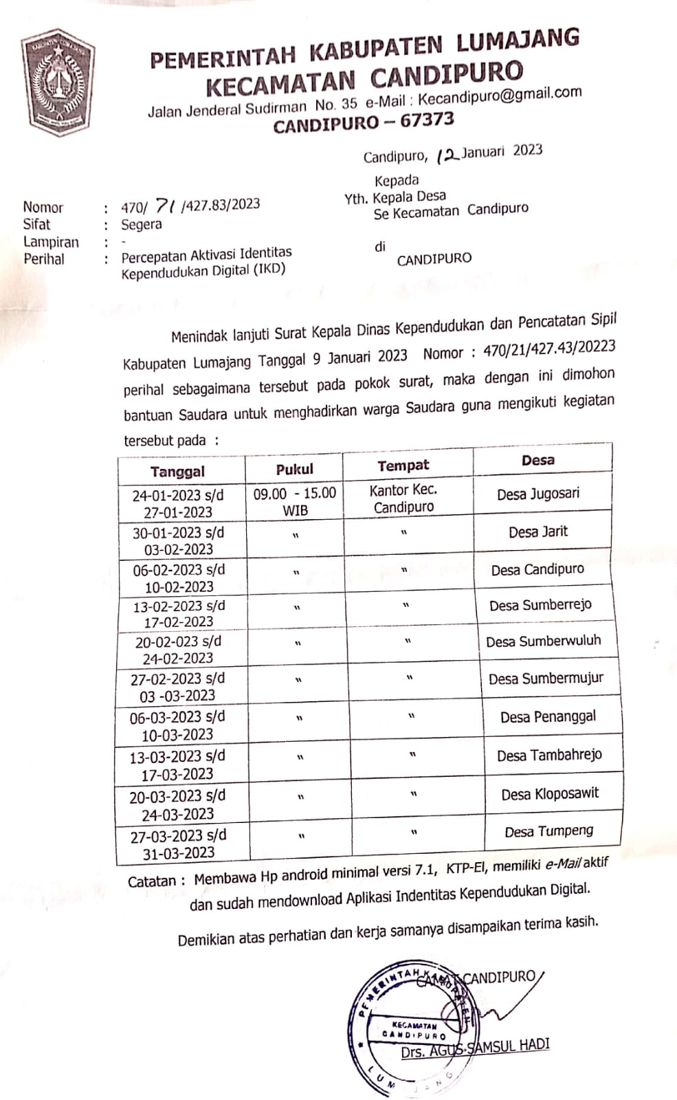 Caranya install Aplikasi Identitas Kependudukan Digital melalui Aplikasi Playstore yang tersedia di HP/Android saudara dan jangan lupa harus mempunyai e-mail yang aktif yaa....Setelah install berhasil dilakukan, maka harap mendatangi Kantor Kecamatan Candipuro sesuai dengan jadwal yang terlampir ya...